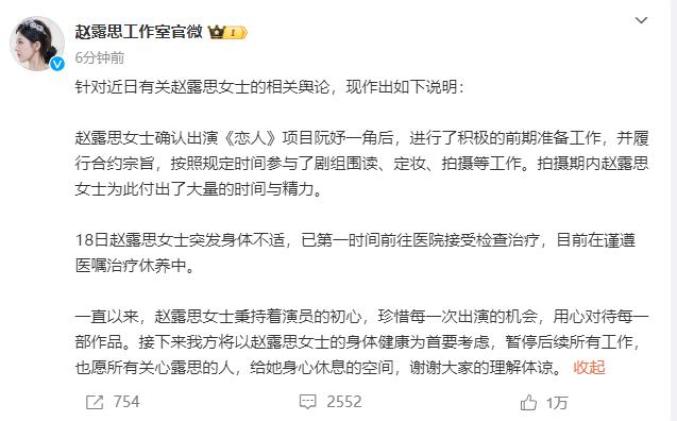 赵露思女性在决定出演《恋人》项目阮邈一角后,进行了积极的准备工作,并履行了合同的目的,并在规定的时间内参加了剧组围读、定妆、拍摄等工作。在拍摄过程中,赵露思女性花费了大量的时间和精力。18日,赵露思女性突然感到身体不适,第一时间去医院接受检查和治疗。目前,她正在遵医嘱进行治疗和休息。