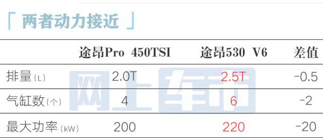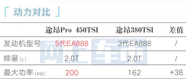 途昂 Pro 内饰采用最新家庭设计,增加副驾驶娱乐屏幕,IQ.Drive 智能驾驶系统等配置。搭载全新 2.0T 发动机(分标准和大功率),标准功率发动机,性能介于此款。 330TSI(137kW) 在380TSI(162kW)之间,高功率发动机的性能接近该型号 530TSI(2.5T V6),还是匹配的 7 速湿式双离合变速器。
