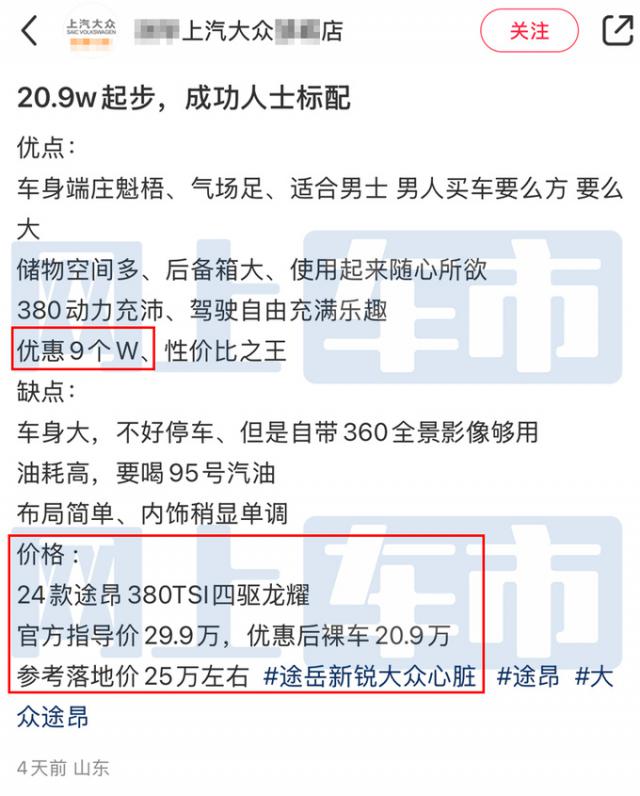 上汽大众经销商销售员表示,24 款途昂 380TSI 四驱龙耀官方指导价 29.9 万,优惠后裸车 20.9 万,优惠 9 一万,参照落地价格 25 万左右。