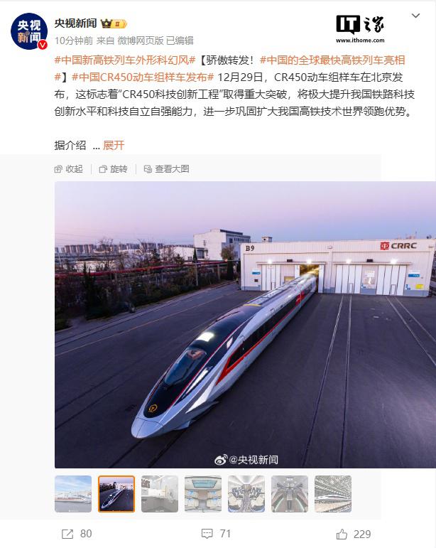 IT 世家 12 月 29 据央视新闻从中国国家铁路集团有限公司获悉,今天(12月12日) 月 29 日)CR450 北京发布了动车组样车,一列 CR450AF 突出“锐龙追梦”,一列 CR450BF 象征着“科技之光”。未来,CR450 在投入商业运营后,动车组,操作速度将达到 400 公里,成为世界上最快的高铁列车。。