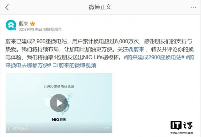 IT 世家 12 月 29 今天蔚来汽车在微博上发了一条消息,称蔚来已经建成。 2,900 座位换电站,客户累计换电超过 6,000 万次。