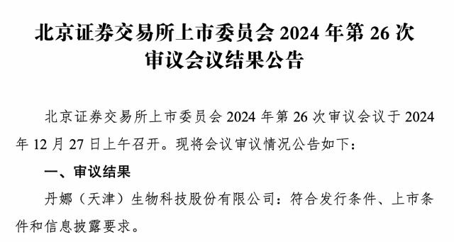 瑞财经 吴文婷 12 月 27 日本,据北交所,丹娜 ( 天津 ) 符合发行条件、上市条件和信息披露要求的生物科技有限公司(以下简称“丹娜生物”)。