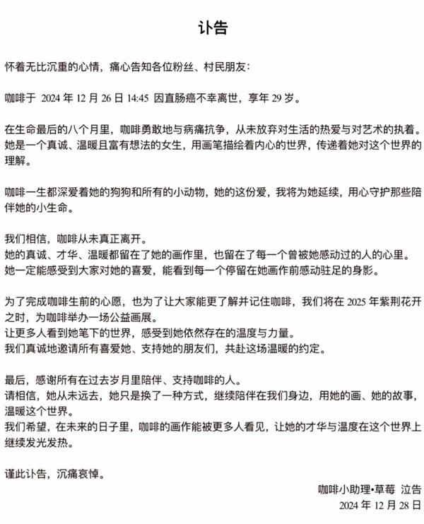 快科技 12 月 29 日前,在抖音拥有的日新闻 285 网络名人绘画博主“咖啡”助手发誓:“网络名人“咖啡”死于直肠癌,年仅一年, 29 岁。