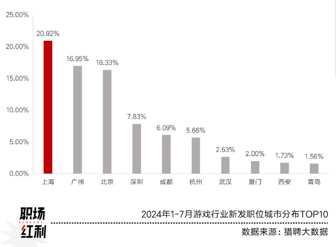 如果你想从事游戏文案,上海等一线城市仍然是最好的选择。从游戏行业新兴岗位的城市分布来看,上海、广州、北京、深圳等一线城市排名前四,其中上海以20.92%的比例领先全国。