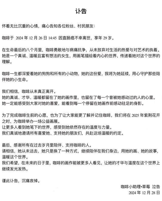12 月 28 当天晚上,网络名人“咖啡”小助理发布了一条信息,称“咖啡已于” 2024 年 12 月 26 日 14 时 45 分为直肠癌不幸死亡,享年 29 岁。"