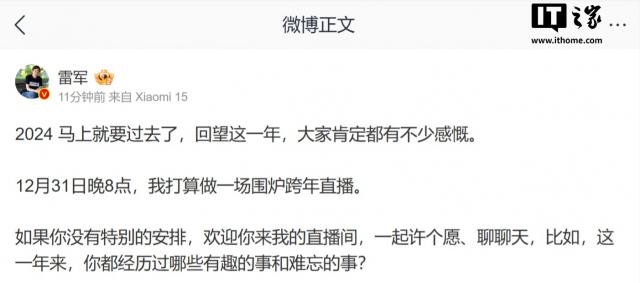 IT 世家 12 月 29 每日新闻,小米创始人,董事长。 CEO 今天雷军宣布,12 月 31 日晚 8 点,打算做一场围炉跨年直播。