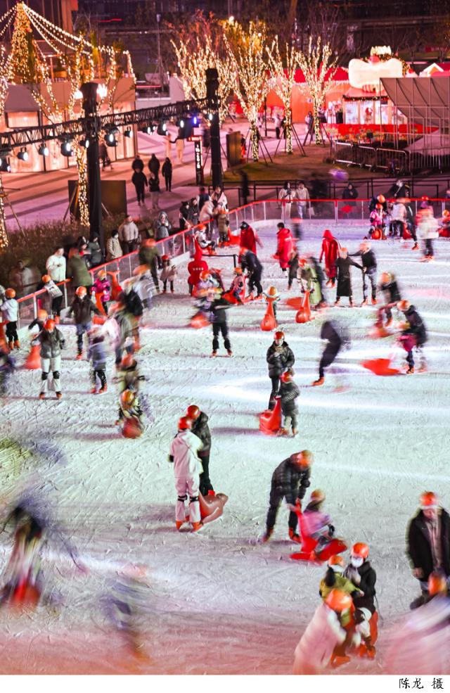 室外徐汇滨江西岸梦中心 1500 平方米室外冰场迅速爆红,成为社交媒体上炙手可热的“网红”。12 月 28 那天晚上,滑冰爱好者在冰场里滑行。