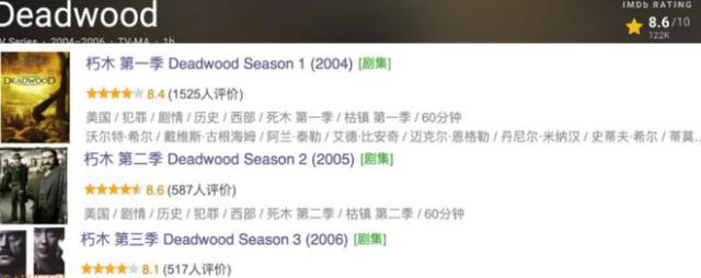 这部 HBO 制作的经典美剧共三季,豆瓣评分高达 8.1-8.6,IMDb 评分 被很多观众称为“史诗级西部剧”的8.6。