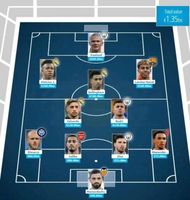 皇马的维尼修斯三叉戟 2 亿欧,曼城的哈兰德也是 2 巴萨边锋亚马尔1亿欧 1.8 亿欧。