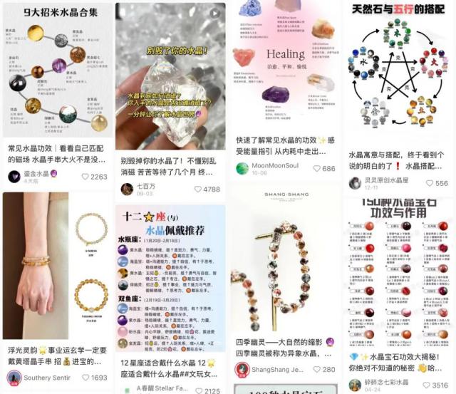 “在小红书上,” # 水晶"和" # “水晶手镯”两个话题分别是 22.3 亿和 9.5 一亿的访问量,仅与“水晶功效大全”相关的信息,就超过了 5000 篇笔记。在这些笔记中,水晶被称为可以改善运气、调节情绪和能量的物品。比如黄色水晶可以调动人的积极性,绿色水晶可以改善人际关系,消除负能量。蓝色水晶代表智力、理性和思维能力,而紫色水晶可以强化精神力量,开悟灵魂。