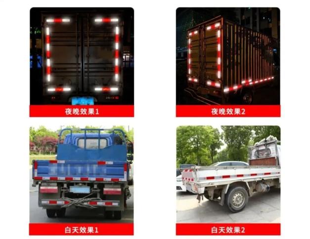 车身后面的车身反光标志应该从白色模块开始,白色模块结束。侧面可以从红色模块开始,但车尾附近的最后一个模块应该是白色单元,容器后面的边缘交叉部分应该是白色单元。贴在车身上的反光标志不会影响车辆的照明和信号设备的性能。而且贴好的反光标志不能打孔打槽,车身的反光标志离地面最低380毫米。