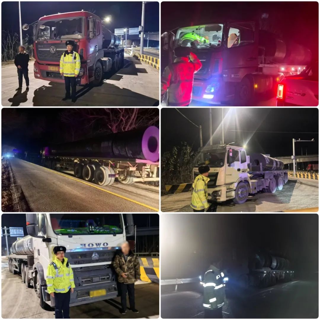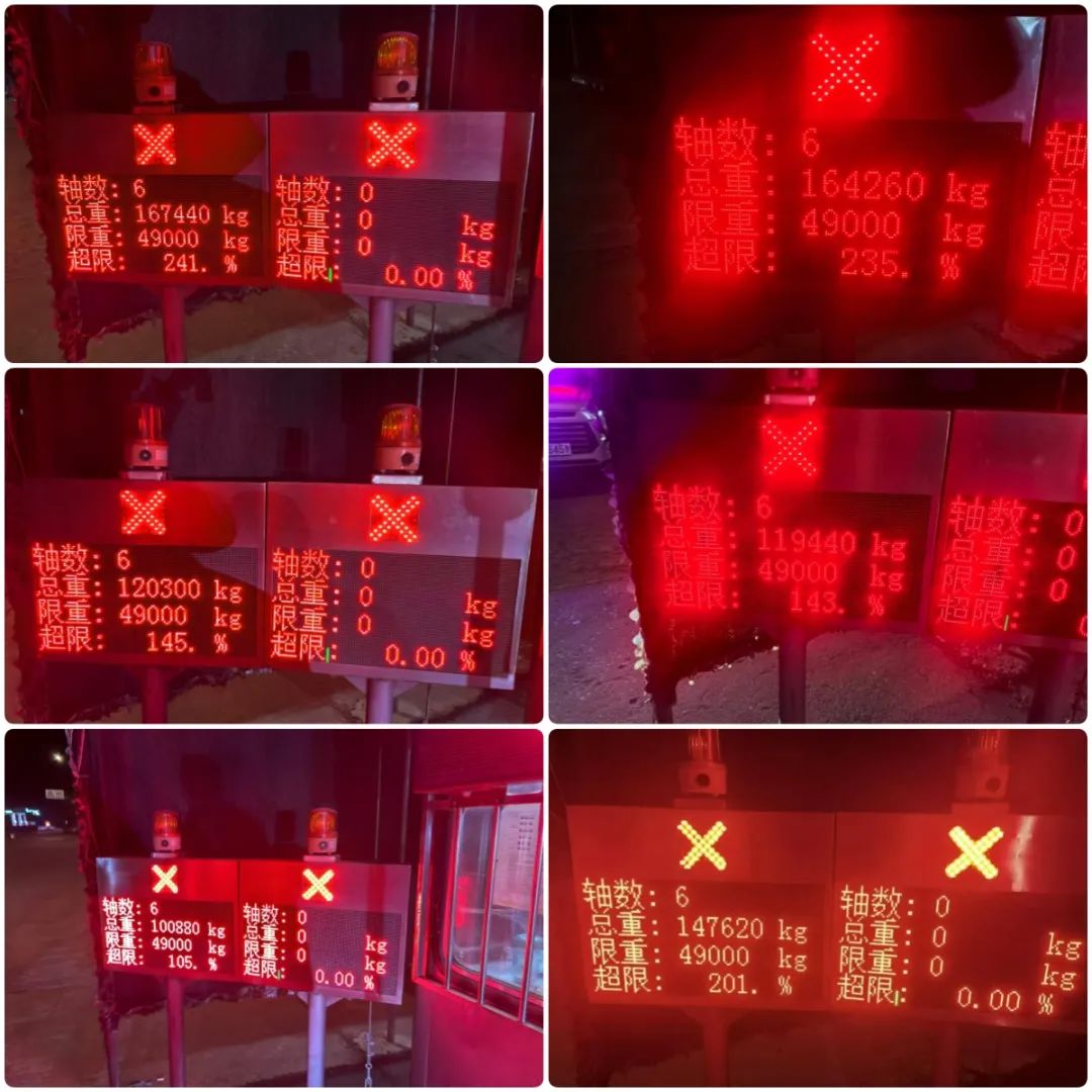 十二月四日三时许,交警林亭口大队民警杨泽带领辅警张俊、张振兴、孙建兴在九园公路巡查过程中,发现6辆重型半挂牵引车有超载嫌疑。警方立即对车辆进行了拦截检查,并引导大货车进行称重检查,结果核载49吨的大货车实载100多吨,最高167.44吨,超载241%。