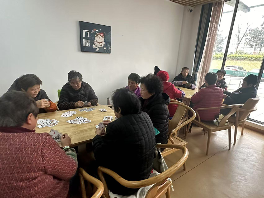 青浦华新镇日间护理中心就像一个老人的免费游乐场,里面挤满了打牌、加入乐趣、聊天的老人。12月18日下午3点左右,六七张方桌上挤满了玩棋牌游戏的老人。来晚了不能加入的老人,站在旁边看着“满足自己的渴望”,时不时兴奋地发帖。