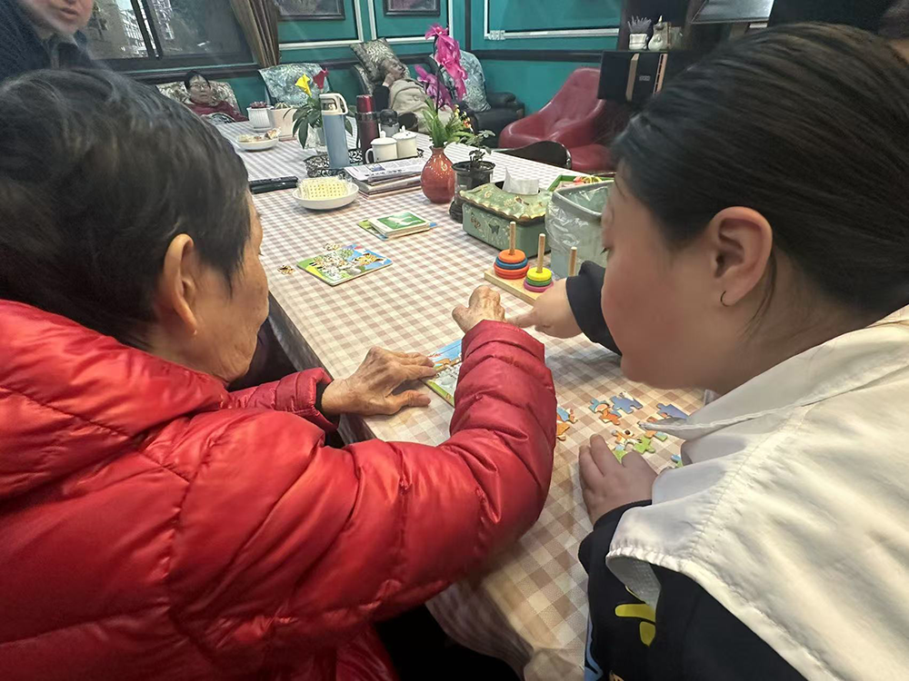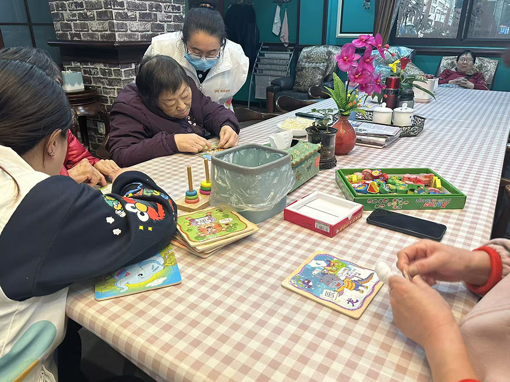 在石二街白天护理中心,认知老人在工作人员的指导下完成了拼图。