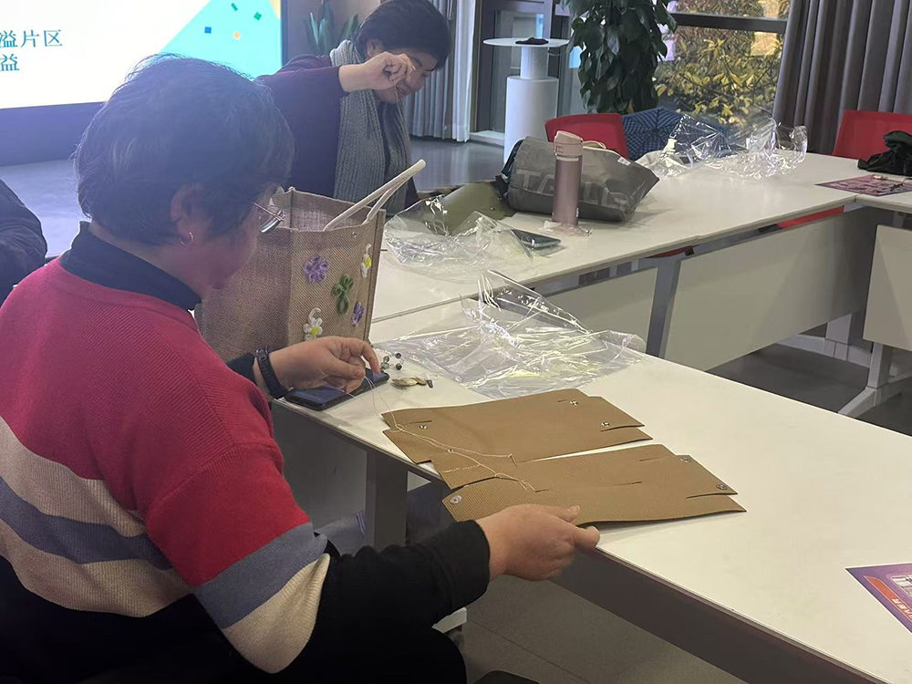 香溢区综合为老中心,老人在做纸巾盒手工制作。