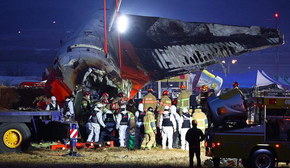 韩国务安机场当地时间12月29日发生重大坠机事故。图为事故现场的客机遗骸。