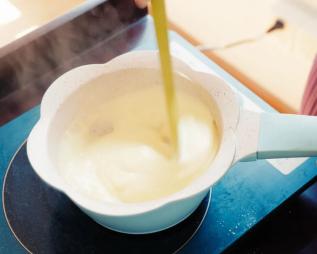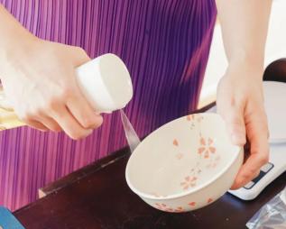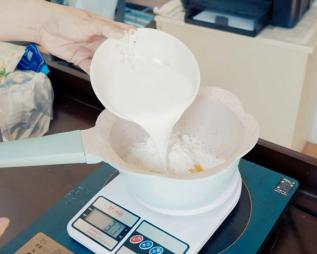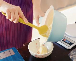 在碗内壁喷上食用油,将奶糊倒入碗中。
