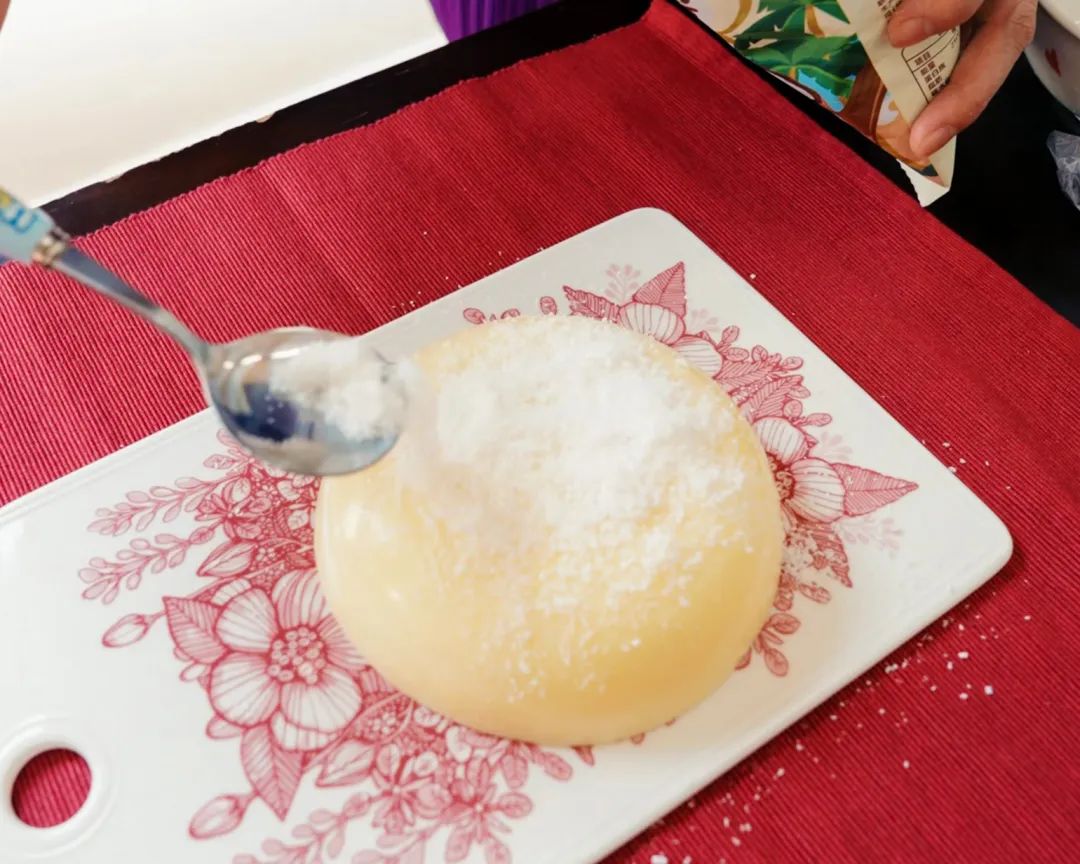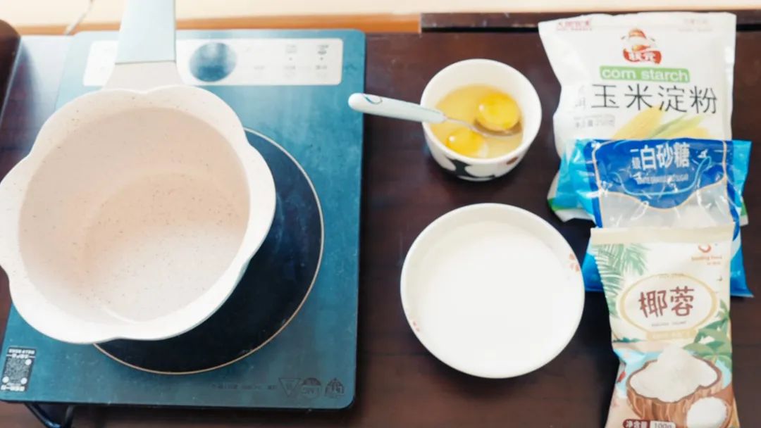 蛋黄质2,淀粉30克,牛奶300克,白糖,椰蓉适当。