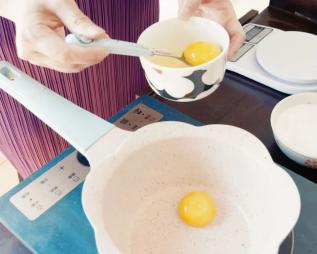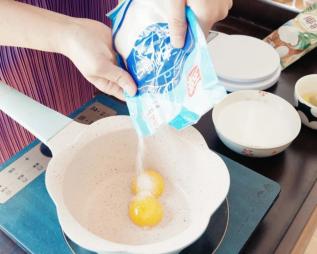 将两个蛋黄放入锅中,根据爱好加入适量的白糖。