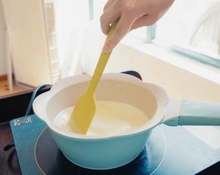 打开小火,一直搅拌到变成粘稠光滑的糊状。