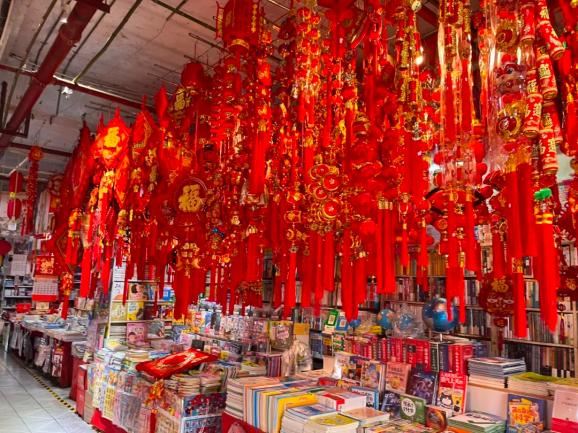 城市文庙书城里,每一个摊位也是红红的,挂满了喜庆的红灯笼,各式蛇年卡通挂件,对联等商品。