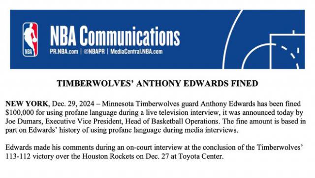 根据官方声明,罚款金额部分是基于爱德华兹在记者采访中使用粗言秽语的历史。爱德华兹是 12 月 28 日森林狼 113-112 击败火箭后,他在场边接受采访时发表了被罚款的言论。在那场比赛中,他打了一个三分准绝杀,但在赛后的采访中,他被罚得很惨。