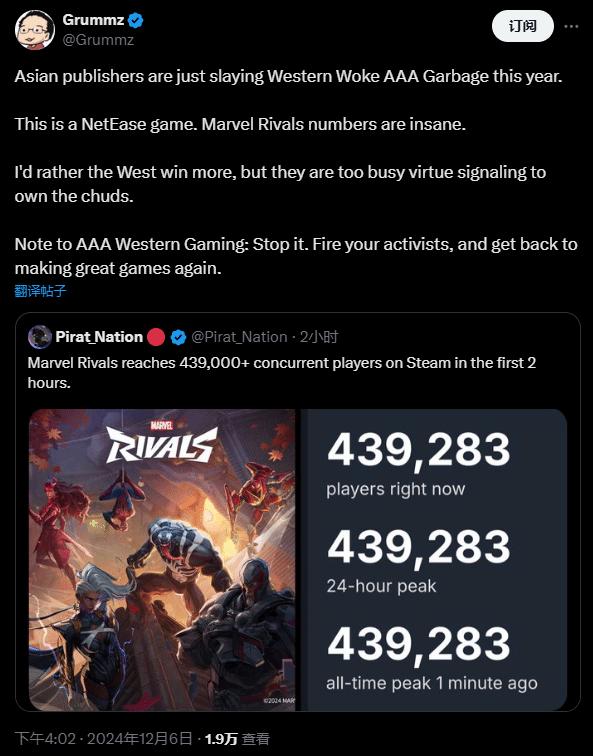 Mike,前暴雪总裁 Ybarra曾在社交平台上发帖称,《漫威漫画争锋》抄袭了《守望先锋》,但很快就被玩家喷到了破甲删推;前暴雪制作人Mark Kern还转发了40万玩家同时在线的《漫威漫画争锋》推文。以此为例,直言今年亚洲开发者的作品爆炸了西方所有“觉醒”的3A大作。