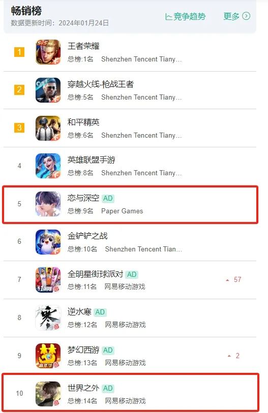 与此类似,今年的女性跑道上升势头明显。从春节档开始,包括叠纸《爱与深空》。、网易的《世界之外》、在国内iOS畅销榜上,腾讯的《光与夜之恋》先后超越了众多头部产品,取得了Top10的成绩。