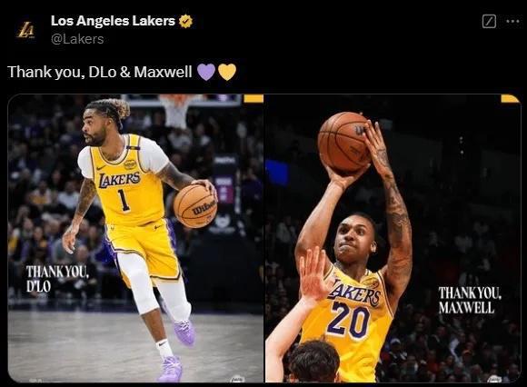 湖人队正式发布了拉塞尔和刘易斯的照片,并配文道:谢谢 Dlo 还有马克斯韦尔。