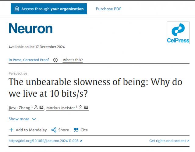 马库斯,加州理工学院教授・郑杰宇,梅斯特和研究生?(Jieyu Zheng,这篇由音译人员撰写的论文强调了外脑和内脑数据吞吐量之间的巨大差异。他们质疑内脑虽然有大约三分之一的大脑神经元(大脑总共有 850 一亿次神经元),但是为什么负责思考我们所经历的大量数据的内脑,它的工作速度却如此之慢。