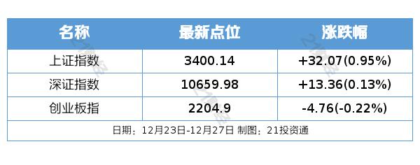 过去一周(12 月 23 日— 12 月 27 日),A 股票三大指数大部分上涨。截至 12 月 27 日收市,上证综指报 3400.14 点,周涨 0.95%;深成指报 10659.98 点,周涨 0.13%;创业板指报 2204.90 点,周跌 0.22%。