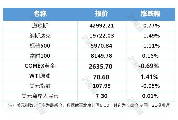 三大股指纽约股市 12 月 27 日收跌。截至 12 月 27 日收盘,道琼斯工业平均指数较前一交易日下跌 333.59 点,收在 42992.21 点,跌幅为 0.77%;标准普尔 500 股票指数下跌 66.75 点,收在 5970.84 点,跌幅为 1.11%;纳斯达克综合指数下跌 298.33 点,收在 19722.03 点,跌幅为 1.49%。本周,纳指累涨 标普累涨0.76% 0.67%,道指上涨。 0.35%。
