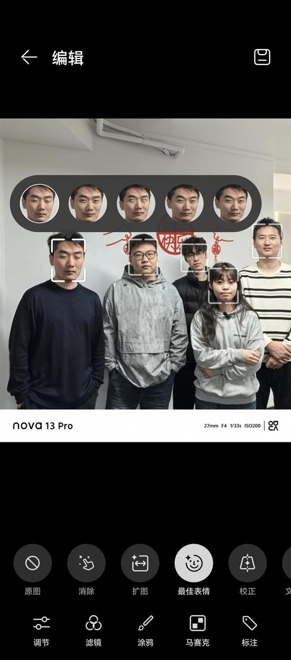 笔者拿华为 nova 13 Pro 给公司的几个小伙伴拍了一张照片,其中一个人闭上了眼睛。