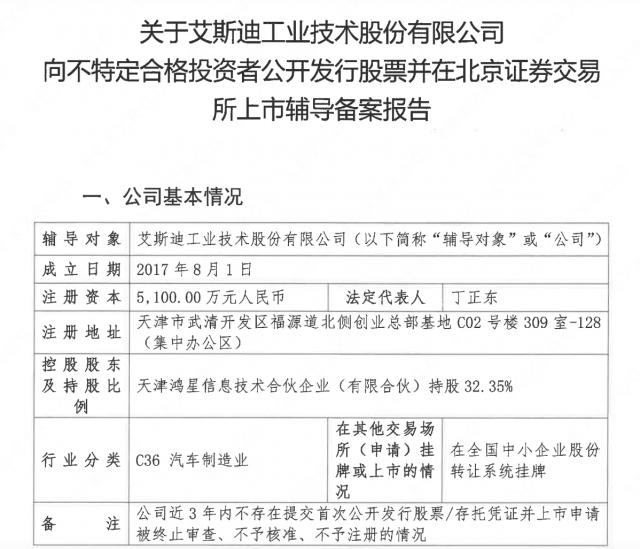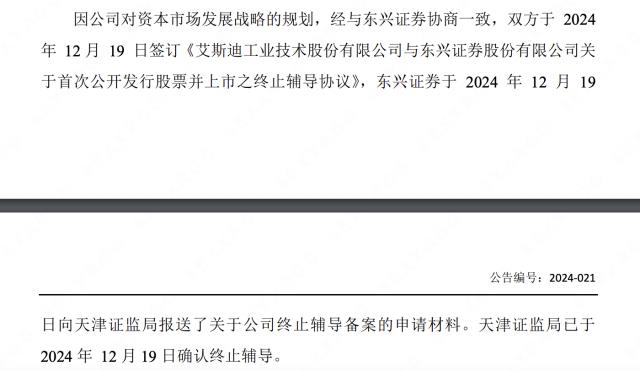 此前于 2022 年 4 月份,艾斯迪提交创业板 IPO 辅导备案后,创业板上市计划调整为北交所上市,当时辅导机构为东兴证券。然而,由于资本市场发展战略的规划,艾斯迪于 2024 年 12 月 19 每天停止指导。