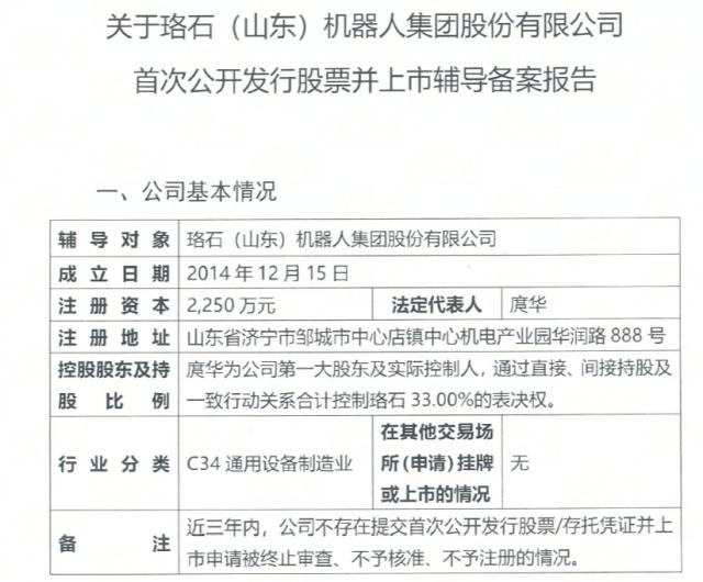 瑞财经 王敏 12 月 26 日本,罗石(山东)机器人集团有限公司(以下简称罗石机器人)在山东证监局备案,辅导机构为国泰君安证券有限公司。