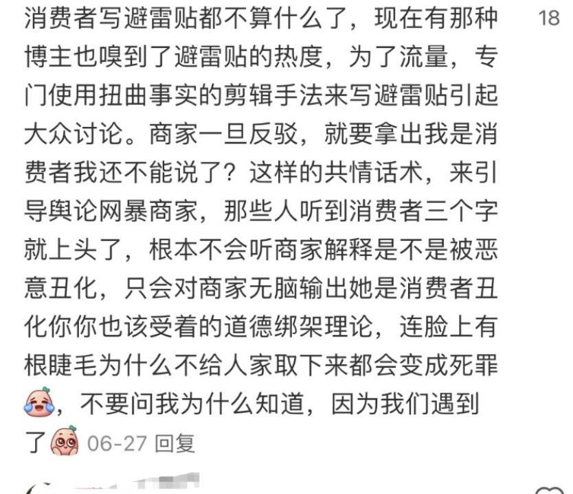 如果商家和个人之间的分歧进入舆论场,个人反而处于强势地位,这也是防雷贴如此威慑的原因。