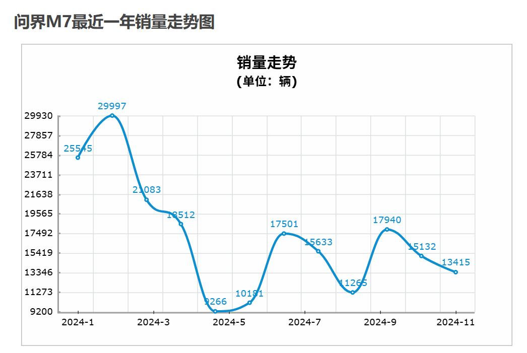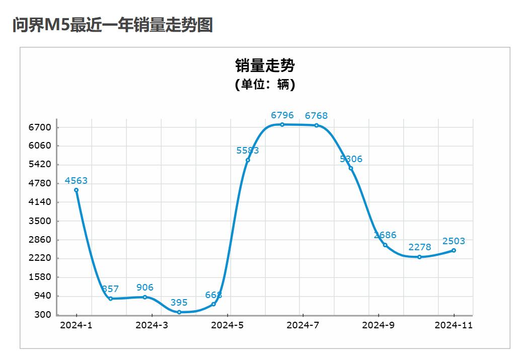今年 4 月,问界 M5 同时又磨了一把剑,但是这次销售刚刚冲了两个月,很快又掉了下来。即使是 M7/9 如此火爆,也带不动这个小弟。