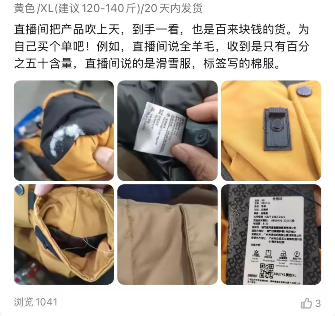 据了解,“BB“是澳门COCO姐”的原创品牌,市场反馈中有很多差评。“客服相信50%的羊毛都是用珍珠棉打开的”“直播间是关于滑雪服的,但是标签上写的棉袄”等问题也是很多低价滑雪服的常见问题,很多消费者说“买的时候穿棉袄不是滑雪服”。