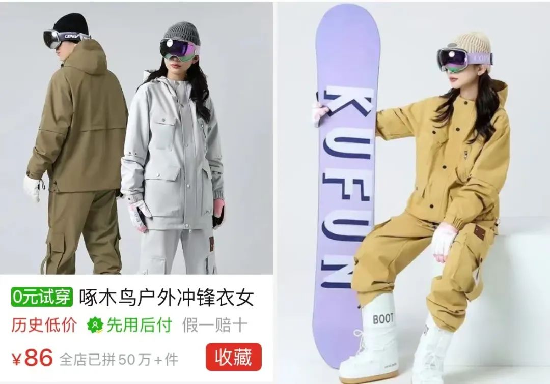 低价格的旗帜被广泛的白牌接过,甚至穿透了底价。一个直观的例子是,在拼多多上,「滑雪服R,滑雪服」滑雪裤的价格在80-100元之间,整个店铺已经拼了10多万件;「啄木鸟」该品牌的滑雪服外套不超过90元,整套拿下也不超过200元,全店拼团已超过50万单。