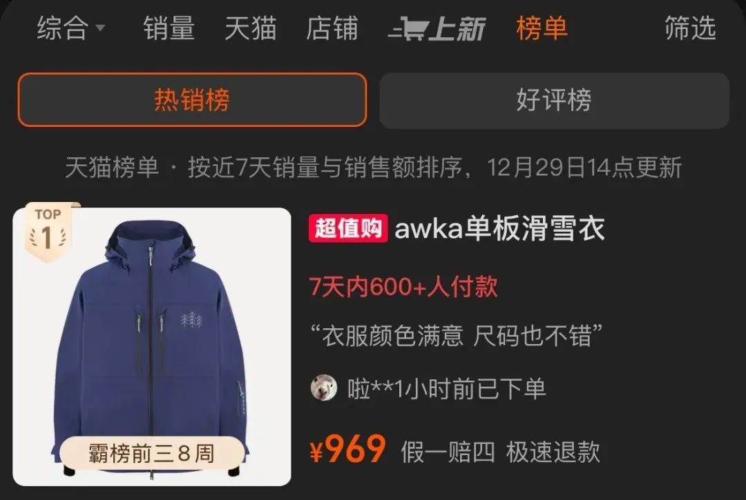 根据天猫榜单,销售额前十的品牌包括南恩,awka、ISEE MIGGA、KK树、大部分是国产品牌的phenix和香蕉,其中awka和ISEEEEE MIGGA是近年来兴起的国产滑雪产品品牌。awka969元的单板滑雪服排名前38周,也被很多滑雪爱好者称为“国货之光”。
