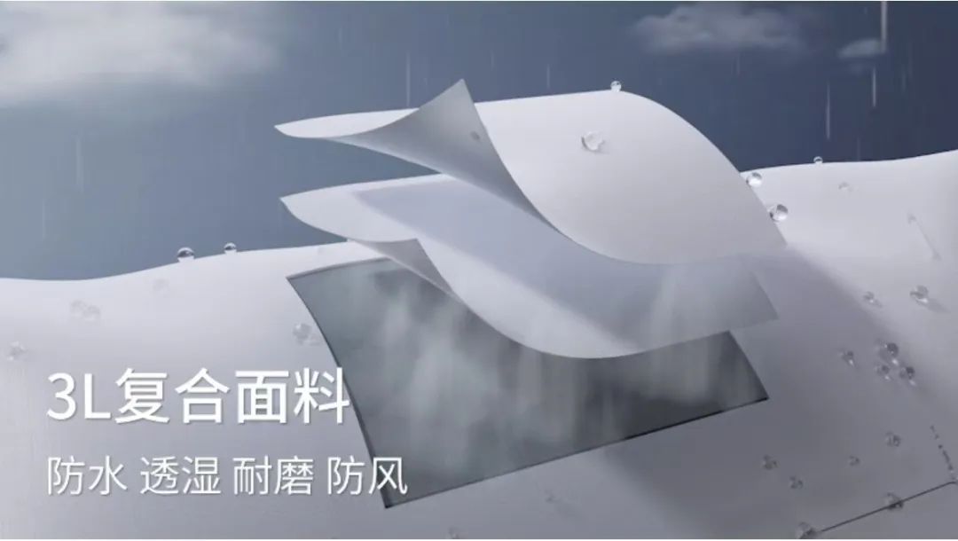 "3L指的是三层结构,2L、2.5L和3L对应不同的面料层数结构。方明告诉剁椒,3L面料由高性能表面面料、微孔防水透气膜、内衬或防水防风加固层组成,可提供额外的耐磨性和硬度。