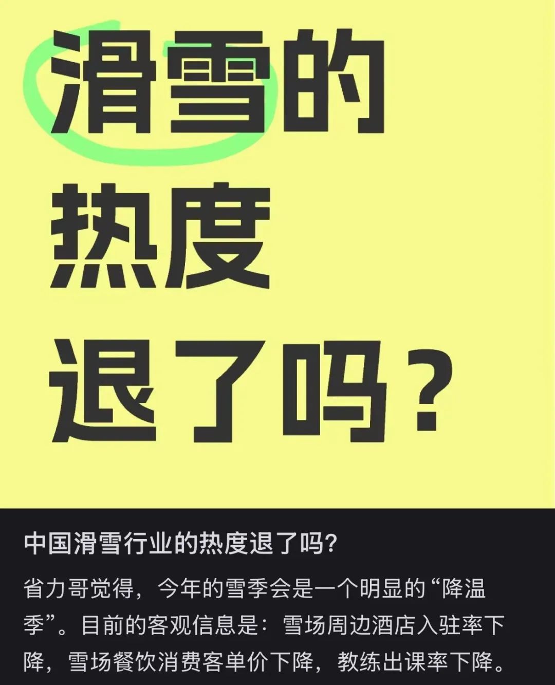 但是另一方面,在今年的雪季,一些教练发现了明显的“降温”现象。她们反映,“雪场周边酒店住房率下降,雪场餐饮消费者数量下降,教练出课率下降。”