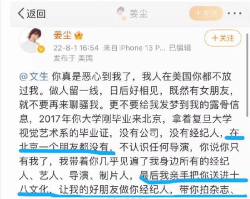 这个问题也有网友提到,早在 2022 2000年,女演员姜尘曾在微博上斥责另一位演员文生,声称文生有女朋友的时候还去“调情”姜尘,发了露骨信息。她还说文生刚毕业的时候,把手中的资源都推荐给了文生。结果文生和姜尘分手了,因为他在剧组认识了其他女孩。