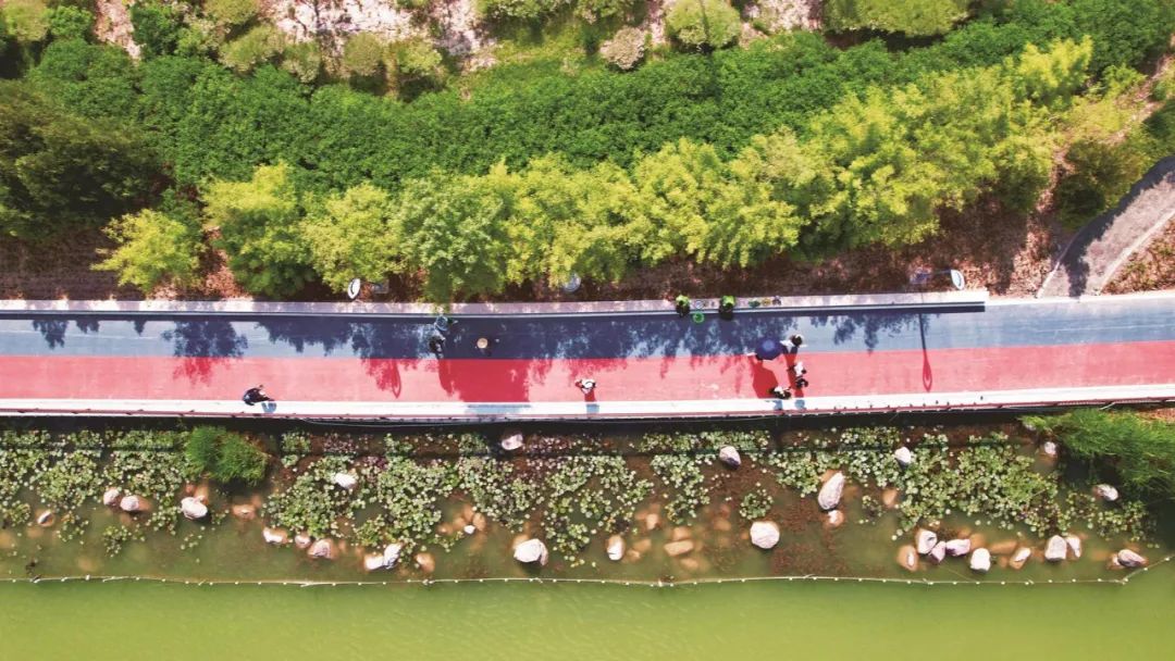 健身步道位于花博园阅海湖东岸,北部与阅海湖西岸健身步道相连,南至鸿曦悦海湾与亲水街相连,连接花博园南北。全线健身步道9543.16米,采用双向双回路设计,路面总宽度4-8米,里程19086.32米。