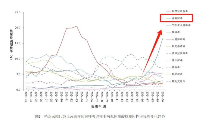 其中,流感进入季节性流行期,近期流感病毒阳性率上升趋势明显。