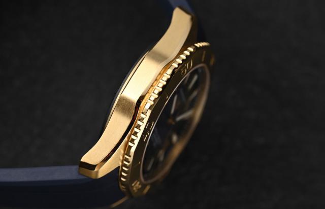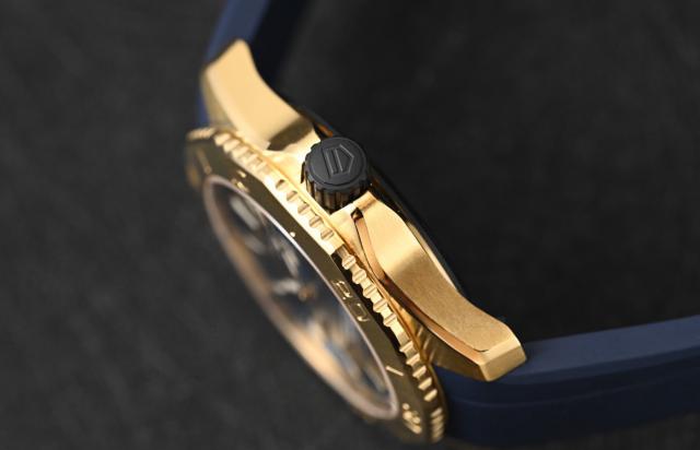 40 毫米表壳作为男性佩戴的黄金表径,尺寸足够精致,厚度足够纤细。潜水表的尺寸一般都比较厚,绝对够好,连日常佩戴都没有压力。手表把上搭配黑色 DLC 涂层旋紧精刚表把,以及金色护肩,当然,如果用钛金属或黄金材料代替精刚表把,肯定会更出众。