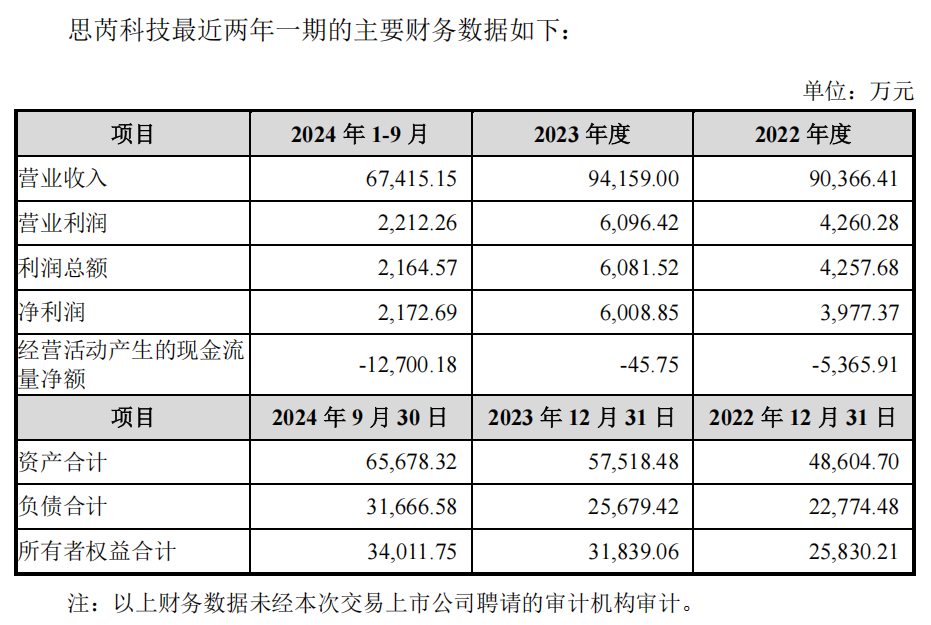 思芮科技在2022年、2023年、2024年前三季度实现了9.04亿元、9.42亿元、6.74亿元的营业收入;净利润分别为3977.37万元、6008.85万元、2172.69万元。
