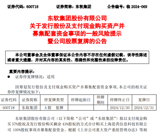 12月30日晚间, 东软集团公告称,公司计划收购 100%股权的上海思瑞信息科技有限公司(以下简称思瑞科技),从而共同构建数字经济服务生态,在数字经济领域补充链条。