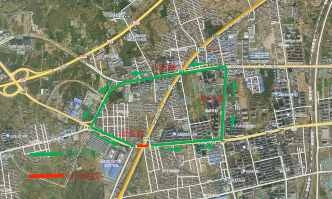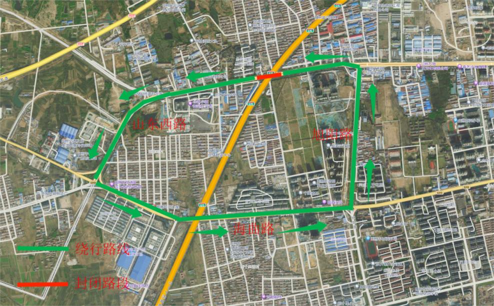 绕道路线:过往车辆和行人可以绕道旭阳路-山东西路。