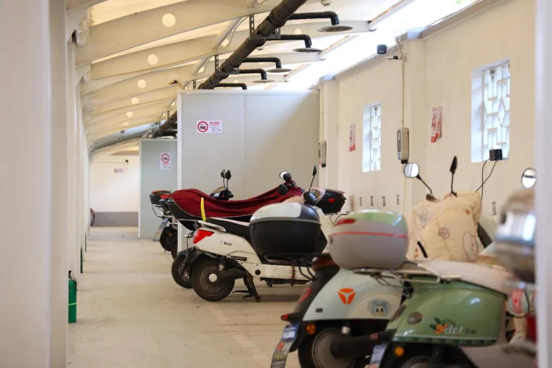 在祥宾一村的电动自行车棚里,记者看到70-80米长的充电空间宽阔清爽,电动自行车摆放有序,消防设备每隔5米左右摆放一次,电动车棚也实现了喷淋设施的全覆盖。